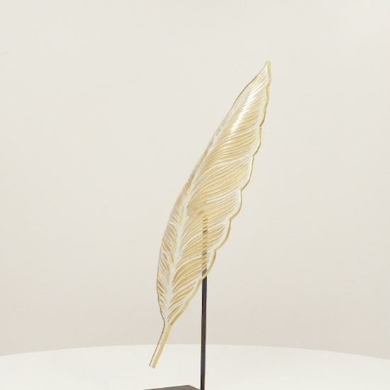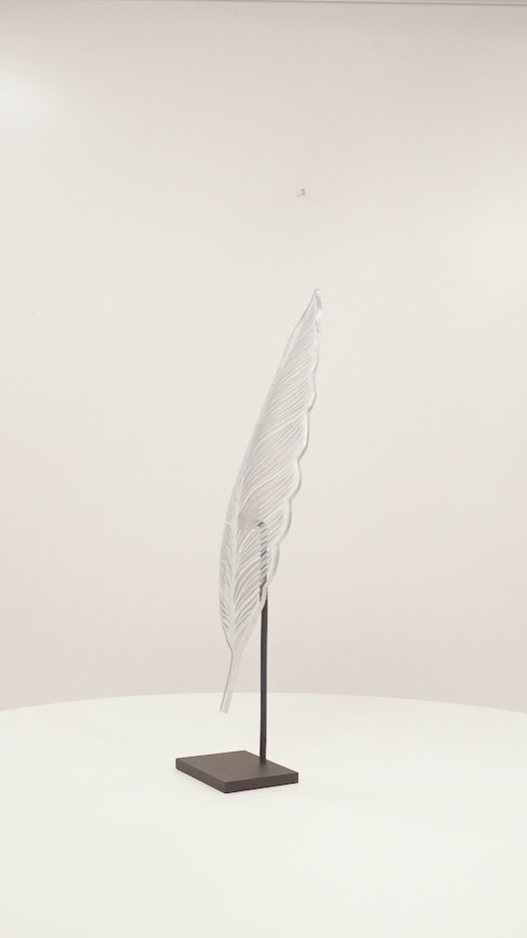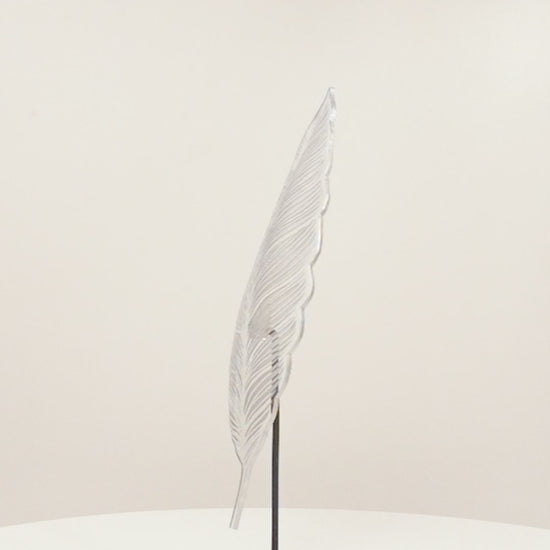 Uzun, ince ve zarif formuyla bir yazı tüyünü andıran Tüy Yaprak - Yükseliş, geçmişin romantik detaylarını modern cam işçiliğiyle buluşturur. Doğadaki tüy formunun o hafif ve kırılgan yapısı, camın kalıcı ve güçlü duruşuyla yeniden yorumlanmıştır. 44 cm’lik yüksekliği ile bulunduğu alanda güçlü bir dikey hat oluşturan bu tasarım, bakışları yukarı doğru çeker ve mekana ferah bir yükseklik hissi katar. Üzerindeki ince çizgisel dokular, ışığı boylu boyunca süzerek zarif bir parıltı yayar. Ustalarımızın serbest şekillendirme tekniğiyle hayat verdiği bu özel parça, hem modern kütüphaneler için sofistike bir detay hem de salonlar için etkileyici bir sanat objesidir.
